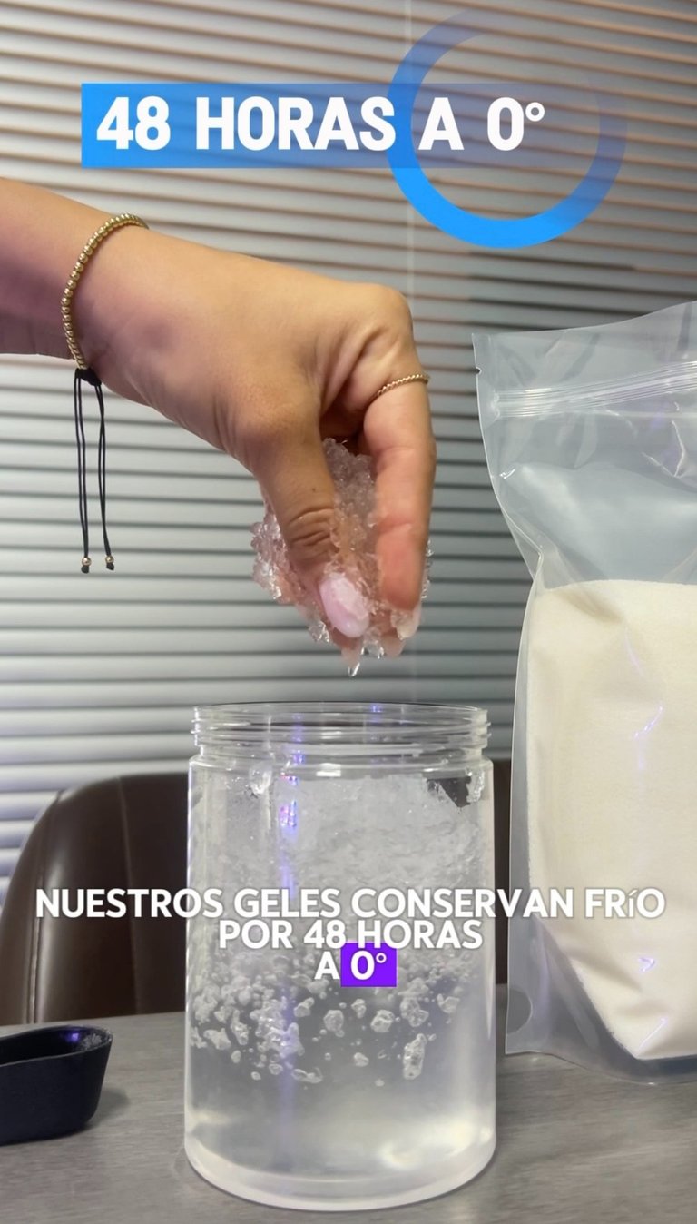 Otros nombres: Carboxivinilpolimero, Geles refrigerante, Hielo seco, Hielo sintético, Geles refrigerante Formula Química o Componentes: Mezcla de Polímeros. APLICACIONES GENERALES: Es un espesante sintético. Produce viscosidades muy elevadas, acumulación de frío y los geles resultantes poseen buena transparencia y brillo. De alta absorción en agua. Utilizado para el transporte de alimentos perecederos con el fin de ayudar a conservar la cadena de frío. Insoluble en hidrocarburos. Producto inocuo. Puede tener contacto con alimentos. Descripción: Es un polímero formado por monómeros, polvo blanco granular y sin olor. Puede hidratarse hasta 200 veces si se le agrega agua destilada o agua desmineralizada, no requiere ser catalizado, insoluble en agua y trabaja por hinchamiento. Usos comunes: • Conservación de alimentos y productos biomédicos. • Transporte de productos congelados. Congela hasta -18°C, para luego ser utilizado para acompañar los alimentos a proteger en cadena de frio en recipientes adecuados hasta por 48 horas a 0°C. Vencimiento: 3 años.